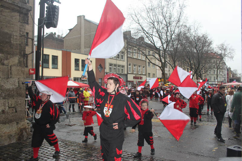 Auf dem Wilhelmplatz sangen die Rabaue gerade "Ich hab gute Laune, draussen scheint die Sonne" - in dem Moment fing es an, aus Eimern zu schütten. Trotzdem liessen sich die hart gesottenen Nippeser Jecken nicht davon abhalten, weiter zu feiern. Ob man dabei bis zum Ende durchgehalten hat, ist allerdings nicht überliefert. Das Korps der Nippeser Bürgerwehr und das Kölner Dreigestirn hatten jedenfalls noch keine Nässe von oben beim Auftritt auf der Wilhelmplatz-Bühne zu befürchten. Erst kurz nachdem das Dreigestirn abgezogen war, startete der Regen. Für die Domstürmer, die Cöllner, die Funky Marys, die Rheinländer, die Kölsche Adler, die Filue und die Kläävbotze schauten hingegen in ein Meer von Regenschirmen ...