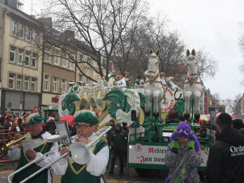 Und auch der erste Umzug der Session, dem Weiberfastnachtsumzug des Reiter-Korps Jan von Werth vom Chlodwigplatz in die Kölner Altstadt, wurde ordentlich nass: Nachdem man bei der Aufstellung bereits klatschnass wurde, startete der Umzug im Trockenen. Als der letzte Wagen die Severinstorburg passierte, setzte wieder ergiebiger Regen ein und durchnässte die Kostüme und Uniformen der Zugteilnehmer. Zuvor stand das traditionelle Spiel um die Sage von "Jan un Griet" wieder auf dem Plan des Reiter-Korps. Das Spiel stand jedoch unter keinem guten Stern und fiel im wahrsten Sinne des Wortes ins Wasser.
