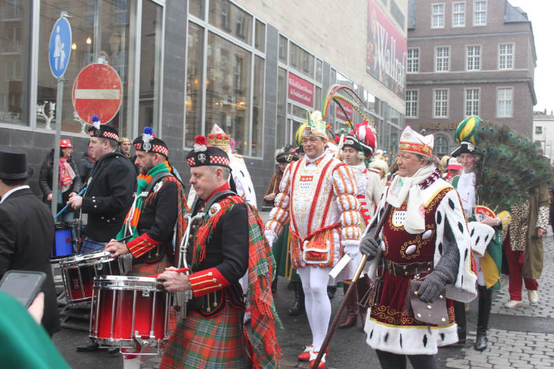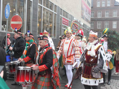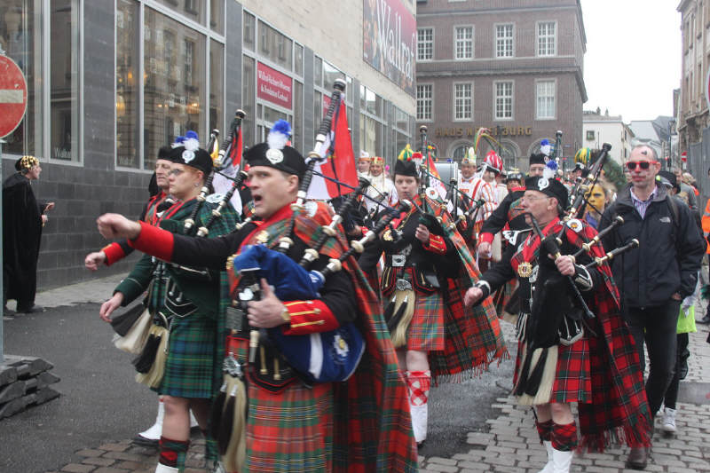 Nachdem die Domstädter Köln gemeinsam mit ihren Freunden der "Royal Naval Piper Society" am frühen Sonntagmorgen zum 16ten Mal einen englisch-kölschen Gottesdienst in der Minoritenkirche gefeiert hatten, zogen die beiden Kapellen gemeinsam mit dem Kölner Dreigestirn in den Gürzenich, wo die Domstädter und ihre schottischen Freunde heute das Vorprogramm für die Kostümsitzung der Große Kölner K.G. bildeten.