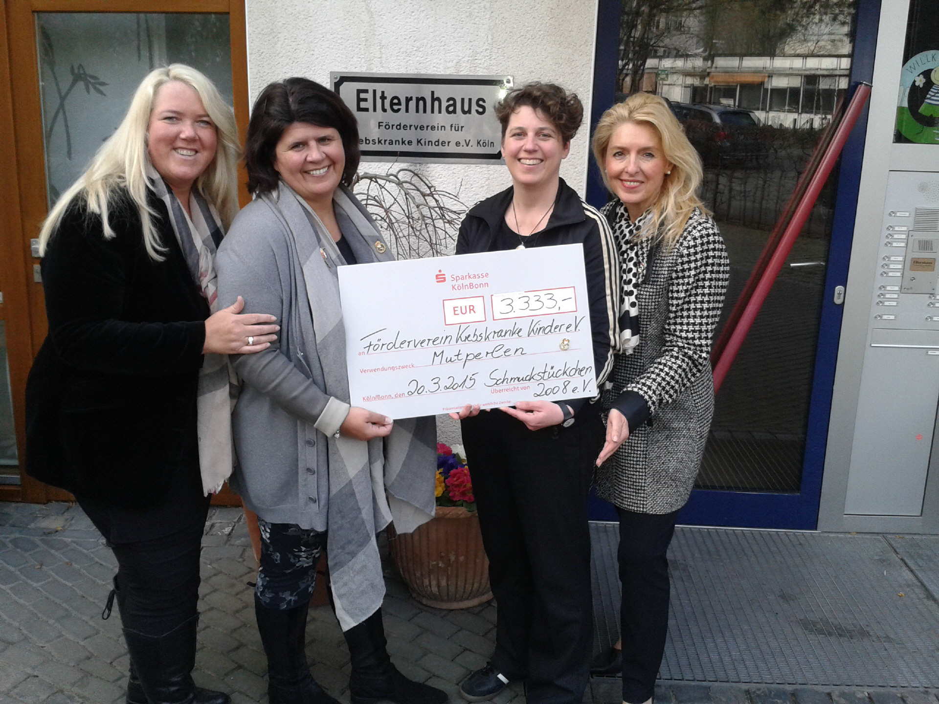 Am Freitag, dem 20. März, war es endlich soweit: Die Schmuckstückchen - vertreten durch die Initiatorinnen dieser Aktion, Marion Becker und Rüya Gazez-Krengel - freuten sich, den Erlös über die jecke Summe von 3333,- Euro an Tina Geldmacher (Vorstand) übergeben zu dürfen.