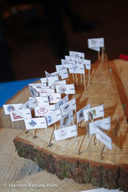 Am Mittwoch, dem 7.Oktober 2015, ist die großartige und einmalige Aktion „Baumscheibe“ der Medienklaafer mit großem Erfolg zu Ende gegangen. Im „Haus des Waldes“, Gut Leidenhausen, übergab der Dendrologe Dr. Burghart Schmidt die Scheibe den Medienklaafern zur Fertigstellung. Die Medienklaafer steckten in der zeitlichen Reihenfolge der Gründung ihrer jeweiligen Gesellschaft ein Fähnchen mit dem Namen und Logo in den entsprechenden Jahresring der präparierten Baumscheibe.