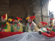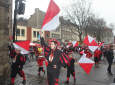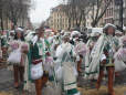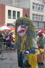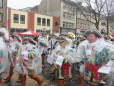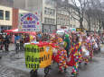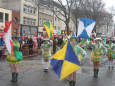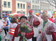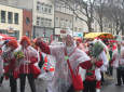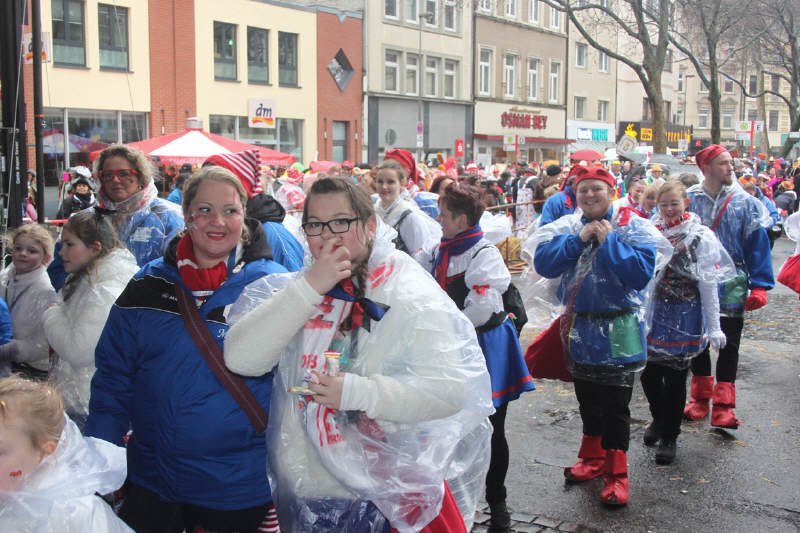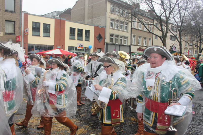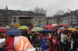 Auf dem Wilhelmplatz sangen die Rabaue gerade "Ich hab gute Laune, draussen scheint die Sonne" - in dem Moment fing es an, aus Eimern zu schütten. Trotzdem liessen sich die hart gesottenen Nippeser Jecken nicht davon abhalten, weiter zu feiern. Ob man dabei bis zum Ende durchgehalten hat, ist allerdings nicht überliefert. Das Korps der Nippeser Bürgerwehr und das Kölner Dreigestirn hatten jedenfalls noch keine Nässe von oben beim Auftritt auf der Wilhelmplatz-Bühne zu befürchten. Erst kurz nachdem das Dreigestirn abgezogen war, startete der Regen. Für die Domstürmer, die Cöllner, die Funky Marys, die Rheinländer, die Kölsche Adler, die Filue und die Kläävbotze schauten hingegen in ein Meer von Regenschirmen ...