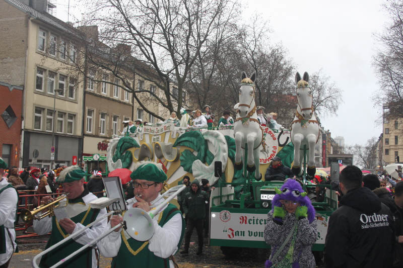 Und auch der erste Umzug der Session, dem Weiberfastnachtsumzug des Reiter-Korps Jan von Werth vom Chlodwigplatz in die Kölner Altstadt, wurde ordentlich nass: Nachdem man bei der Aufstellung bereits klatschnass wurde, startete der Umzug im Trockenen. Als der letzte Wagen die Severinstorburg passierte, setzte wieder ergiebiger Regen ein und durchnässte die Kostüme und Uniformen der Zugteilnehmer. Zuvor stand das traditionelle Spiel um die Sage von "Jan un Griet" wieder auf dem Plan des Reiter-Korps. Das Spiel stand jedoch unter keinem guten Stern und fiel im wahrsten Sinne des Wortes ins Wasser.
