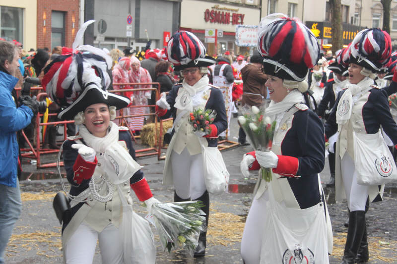 In Köln-Sülz auf dem Hermeskeiler Platz startete man hingegen schon im Regen! Hier waren dann längst nicht so viele Jecken zu sehen als bei trockenem Wetter. Ähnlich trüb war es bei der Eröffnung des Straßenkarnevals in Köln-Deutz, wo sich vor St. Heribert nur wenige Jecken blicken liessen. Auch auf dem Alter Markt, bei der offiziellen Eröffnung des Straßenkarnevals durch das Altstädter Korps, feierten die Jecken bis zum Einsetzen des Regens. Zum ersten Mal eröffnete hier die Kölner Oberbürgermeisterin Henriette Reker den Straßenkarneval in einer Uniform der "Kölsche Funke rut-wiess vun 1823" - und erlaubte sich dabei einen Faux-pas, als sie sich im Interview für die tollen "Prinzenuniform" bedankte.