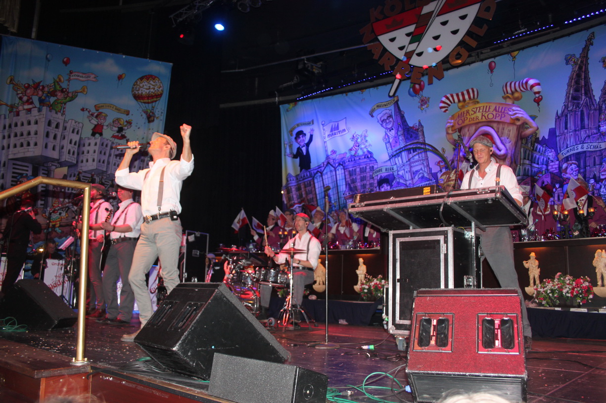 Nach der Pause zog das Traditionskorps des Treuer Husar Köln auf die Bühne. Das Kölner Dreigestirn besuchte die Gesellschaft. Die Domstürmer und ihre Hits brachten die Jecken von den Stühlen. Fritz Schopps als "Et Rumpelstilzje" sorgte noch einmal für Lacher im Saal. Die Guggemusik "Nachtfalter Schränzer", die bereits in den Kölner Schull- un Veedelszöch mitgegangen war, sorgte mit ihren einmaligen Sound für Stimmung. Mit der jungen Band "cat ballou", den Paveier und den Räuber ging die Sitzung bis in den späten Sonntagabend ...
