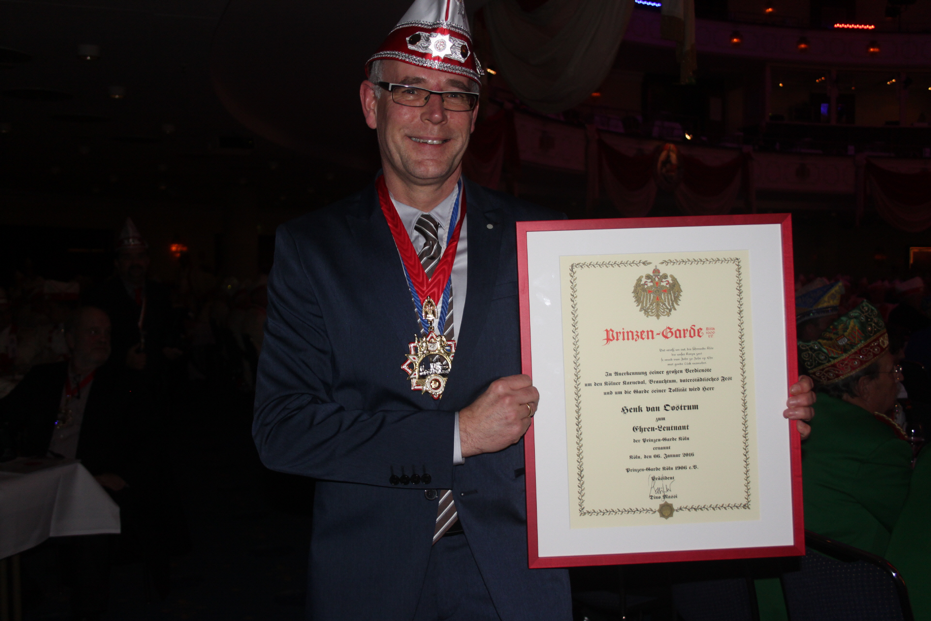 Geehrt wurden zahlreiche Karnevalisten mit Ehrentiteln des Korps, darunter auch der neue Herbergsvater der Kölner Hofburg, des Pullman Cologne, Henk Jan van Oostrum (Foto). Aber auch Prinzen-Gardisten erhielten Ehrungen, darunter - stellvertretend für alle Geehrten genannt - Willy Frank, Hans-Karl Jung, Heinz-Jürgen Palm und Dieter F. Storck für ihre 50-jährige Mitgliedschaft in der Prinzen-Garde Köln. Unter den zahlreichen Ehrengästen waren Ex-Oberbürgermeister Jürgen Roters, Volker Wagner vom Bund Deutscher Karneval, Heinz-Günter Hunold von den Roten Funken, Jörg Mangen vom Reiter-Korps Jan von Werth, Markus Wallpott von der Bürgergarde blau-gold, Dr. Joachim Wüst vom Festkomitee Kölner Karneval und Bernhard Conin, Chef von KölnKongress.