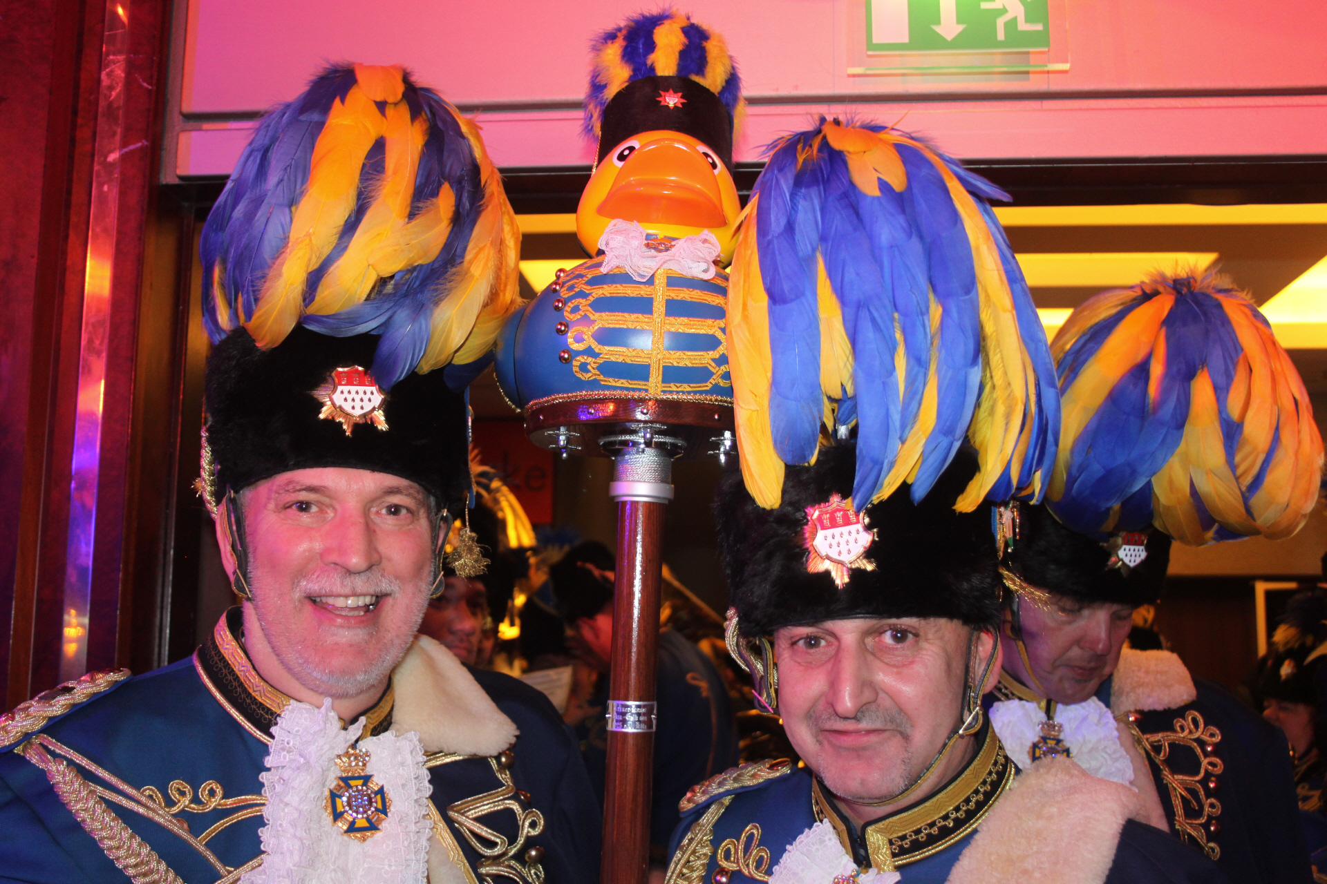 Besonders gewürdigt wurde auch Dr. Marko Schauermann, der Amtsvorgänger von Markus Simonian in den letzten zwölf Jahren. Den Ehrensäbel hatte Schauermann bereits in der letzten Session erhalten. Auch hier gab es anschließend eine stärkende Erbsensuppe, bevor es an die Ehrungen und Beförderungen ging. Beim Einmarsch des Korps staunten einige Gäste nicht schlecht, führte Schatzmeister Kurt Wietheger doch eine überdimensionale Quietscheente in Husarenoutfit auf einem Standartenstock mit - eine solche Ente aus Marzipan befand sich übrigens auch auf der Torte für Präsident Simonian. Der Hintergrund ist einfach: Seit einigen Monaten reist eine HusarEnte durch die Welt und lässt sich an allen möglichen Orten fotografieren. Diese HusarEnte hat ganz viele Kameraden, die es auf den Sitzungen des Treuer Husar käuflich zu erwerben gibt. Und die große HusarEnte wird bei den Aufzügen des Korps mit durch die Säle ziehen. Damit haben die blau-gelben Husaren ein Alleinstellungsmerkmal, denn sie sind das erste Traditionskorps mit eigener Quietscheente, tschuldigung, HusarEnte!