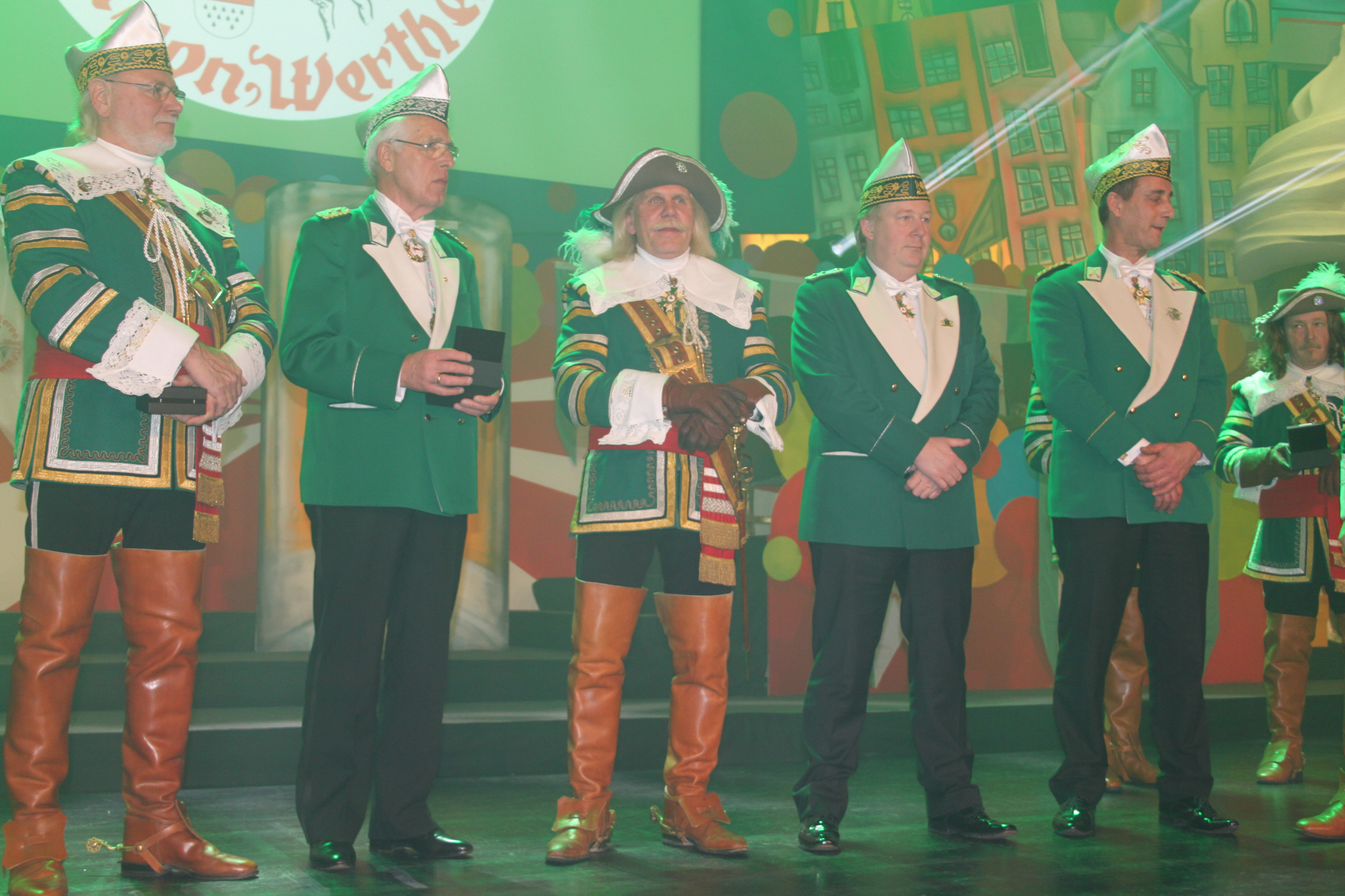 Das Reiter-Korps Jan von Werth, vertreten durch Präsident Jörg Mangen und Wolfgang Acht, überreichten der Prinzen-Garde Köln aus einem Nachlass eines verstorbenen Korpsmitglieds einige Karnevalsorden, darunter auch Orden aus den späten 20er Jahren des vorigen Jahrhunderts. Prinzen-Garde-Präsident Dino Massi war sichtlich gerührt und Mangen stolz darauf, dass man die alten Schätzchen vor der Versteigerung auf einem bekannten Onlinemarktplatz bewahren konnte.