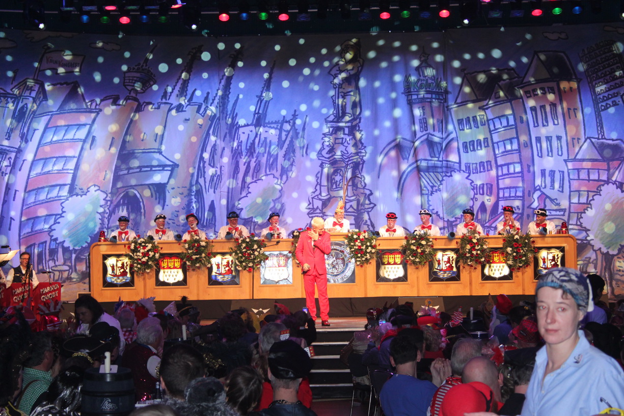 Tenor Norbert Conrads stimmte die Jecken auf den Abend ein und unterhielt musikalisch während des Einzugs des Elferrats die Gäste. Querbeat sorgte anschließend für Stimmung im Saal. Die Kinder- und Jugendtanzgruppe "Rheinmatrosen Minis" zeigten ihr tänzerisches Können und bewiesen, dass sie den Förderpreis der KAJUJA, den die Gruppe vor wenigen Tagen erhielt, zu Recht erhalten hatte. Die Labbese brachten mit ihren Liedern die Sitzungsgäste zum Schunkeln. Guido Cantz sorgte mit seinem Redebeitrag für Lachsalven im runden Festsaal. Zum Ende der ersten Abteilung zog das Korps der Bürgergarde blau-gold in den Saal ein. Nach der tänzerischen und musikalischen Darbietung des Traditionskorps ging es in die Pause.