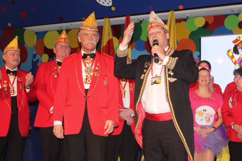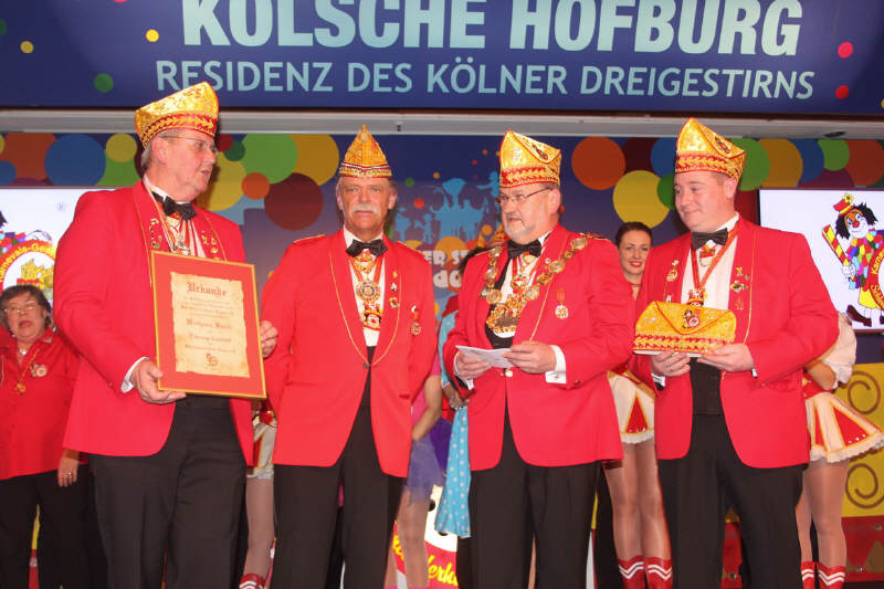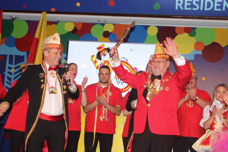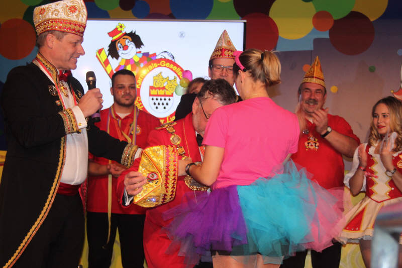 Nachdem sich Vorstand und Elferrat auf der Bühne versammelt hatten, rief Wolfgang Brock, bis zur letzten Jahreshauptversammlung Präsident der Gesellschaft, den Festkomitee-Präsidenten Markus Ritterbach und seinen Vize Christoph Kuckelkorn auf die Bühne. Weiterhin brachte Ritterbach auch die Ehefrau und die beiden Töchter von Hellmut Schramm mit auf die Bühne. Hintergrund war die Übergabe der Präsidenten-Insignien der Gesellschaft an den neu gewählten Präsidenten Hellmut Schramm. Normalerweise wird dieser Akt von Ritterbach vorgenommen, doch dieser war der Meinung, dass die Familie die Übergabe vornehmen sollte. Und so erhielt Schramm durch seine beiden Töchter die Präsidentenkette und das -zepter. Nach einem kurzen Dank wandte sich Schramm an seinen Amtsvorgänger. Er erinnerte an die Verdienste von Wolfgang Brock, der nicht nur 24 Jahre Präsident war, sondern vorher schon zahlreiche Vorstandsämter in der K.G. Schlenderhaner Lumpe inne hatte. So kann Brock auf insgesamt 41 Jahre Vorstandsarbeit in seiner Gesellschaft zurückblicken. Und da Brock bereits alle Auszeichnungen der Gesellschaft, des Festkomitees und des Bund Deutscher Karneval hat, konnte man ihm nur ein Amt bieten - und so ernannte Hellmut Schramm seinen Vorgänger Wolfgang Brock zum Ehrenpräsidenten der Schlenderhaner Lumpe!