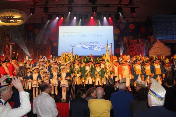 ... doch was war das: Mit den letzten Klängen der "Fauth Dance Company" begann die Jägerkapelle Straberg, einen zünftigen Marsch zu spielen - und es marschierten Abordnungen der Kölner Traditionskorps in den Saal ein. Bei den Saalverantwortlichen des Gürzenich merkte man die Verärgerung an, denn dieser Aufzug war nicht abgesprochen! Hintergrund des Einmarsches war, dass Luftflotte-Präsident Eric Bock und Literat Jürgen Schweder am Aschermittwoch ihre Ämter zur Verfügung stellen. Ihnen zu Ehren zogen die Korps ein und bildeten für die Verabschiedung der beiden langjährigen Vorstandsmitglieder ein farbenfrohes Bild. Der Vorstand der K.G. Sr. Tollität Luftflotte ehrte ihr Kollegen mit dem Fööss-Klassiker "En uns´rem Veedel". Für die Gürzenich-Verantwortlichen ein Fiasko, denn zu dem Zeitpunkt als die Jecken auf der Bühne sangen, sollte eigentlich der Einlass für die zweite Veranstaltung des heutigen Tages starten ...