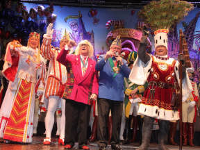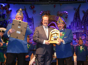 Beim Aufzug des Kölner Dreigestirn der Session 2016 zu Beginn der zweiten Abteilung entdeckten die Tollitäten in der ersten Reihe Hans Süper, den bekannten Komiker des legendären "Colonia Duett". Die Narrenherrscher holten Süper unter dem Jubel der Jecken auf die Bühne, um ihm die Prinzenspange der Session zu überreichen. Nach dem Auszug der Tollitäten kam der Elferrat für eine besondere Ehrung nach vorne auf die Bühne - Peter Raddatz, der als "Mann met däm Höötche" für Jahrzehnte zu den Top-Rednern des Kölner Karnevals gehörte und der vor einigen Jahren in den karnevalistischen Unruhestand gegangen ist, wurde zum "Grielächer des Jahres 2015" ernannt. Präsident Rudi Schetzke übergab Raddatz die gleichnamige in Messing getriebene Ehrengabe, geschaffen von Metallbildhauer Tobias Kreiten. Nach dieser Ehrung sorgten Guido Cantz und Marc Metzger als "Dä Blötschkopp" wieder für Lachsalven, während die Bläck Fööss und die Räuber für Schunkelstimmung im weiten Rund des Maritim Hotel Köln sorgten.