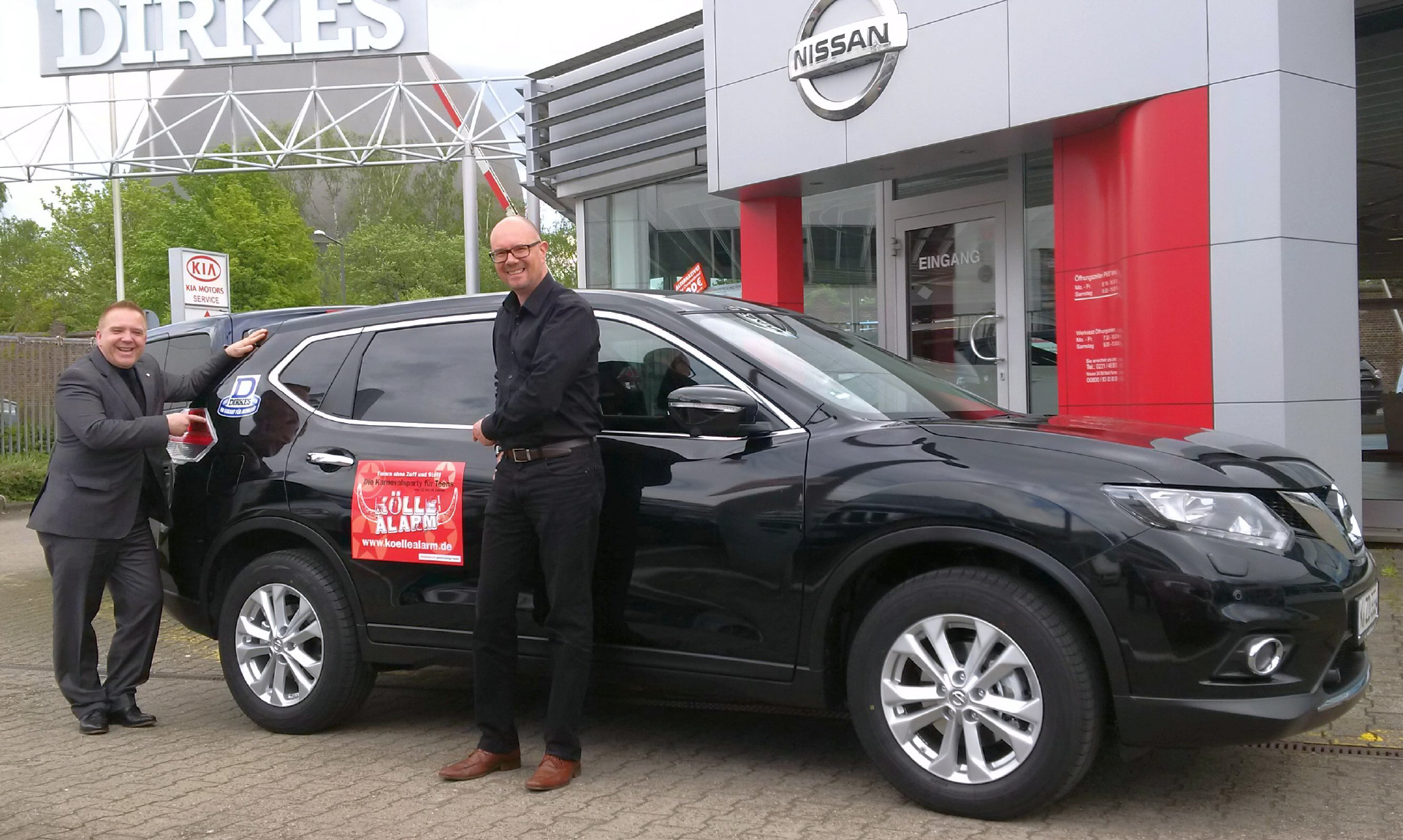Die erfolgreiche Zusammenarbeit zwischen der Automobilgruppe Dirkes und KölleAlarm e.V., dem Verein, der jährlich Kölns größte alkoholfreie Karnevalsparty für Kids ausrichtet, wird fortgesetzt. Aus den Händen von Marketingleiter Elmar Vogel konnte der 1. Vorsitzende, Frank Tinzmann, einen nagelneuen Nissan X-Trail entgegennehmen, der dem Verein für vier Jahre zur Verfügung gestellt wird.