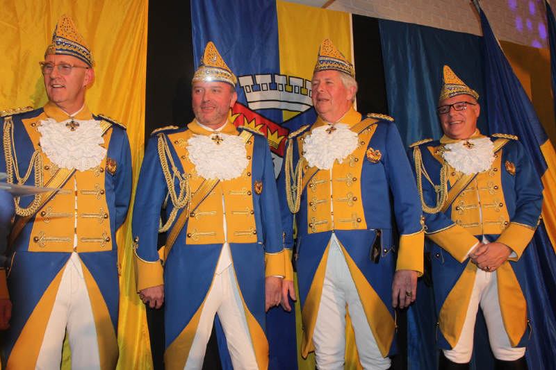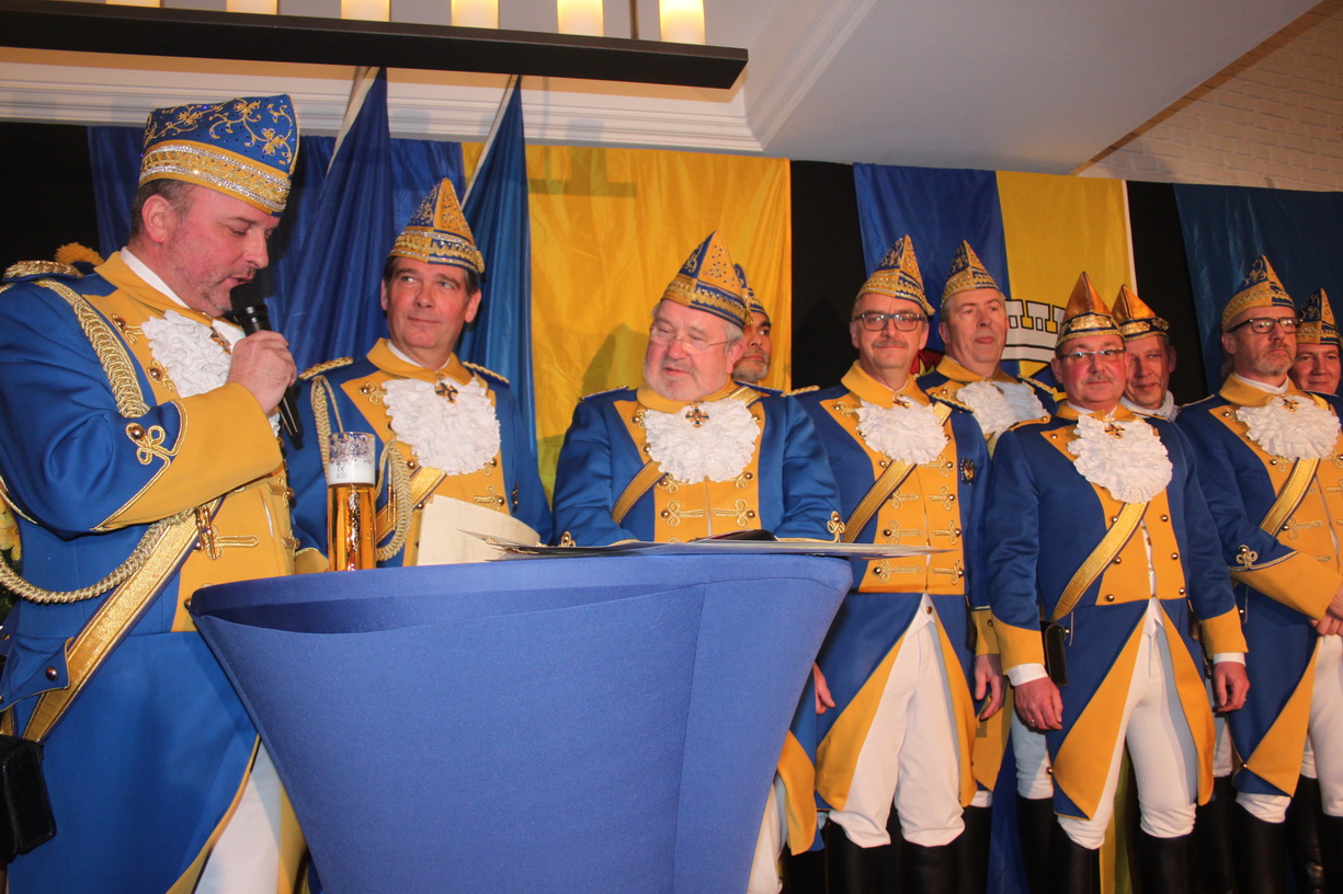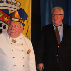 Bürgergarde-Präsident Markus Wallpott mit 3-Tage-Bart. Sein Kommentar: "Ich lasse mir den Bart jetzt etwas länger wachsen. Dann rasiere ich den ab und streue mir die Haare dann auf meinen Kopf ..." - Gelächter bei seinen Korpskameraden und den geladenen Gästen. Pünktlich um 19 Uhr zog der Regimentsspielmannzug in das Brauhaus ein und eröffnete den Appell mit dem neuen Potpourri. Bevor es an die Ehrungen, Vereidigungen und Beförderungen ging, statteten die Sternsinger des Kölner Doms dem Korps ihren Besuch ab, um für Gottes Segen zu sorgen. Anschließend wurde im Eiltempo geehrt und vereidigt. Besonders erwähnen muss man bei den Ehrungen Präsident Markus Wallpott für 35-jährige Mitgliedschaft sowie Heinz Birkhoven und Fritz Odenthal für 40-jährige Mitgliedschaft. Odenthal, Ehrenkoch der Bürgergarde, war sichtlich ergriffen - und freute sich darüber, dass Wallpott ihn einlud, in der Session jederzeit mit "seinem" Korps mitzufahren, wenn es die Gesundheit erlauben würde. Nach der Vereidigung der neuen aktiven Mitglieder ging das Kommando an die Küche: "Essen kann serviert werden!"
