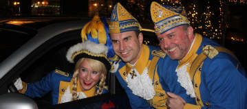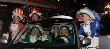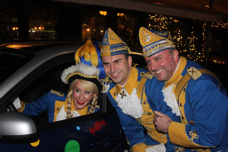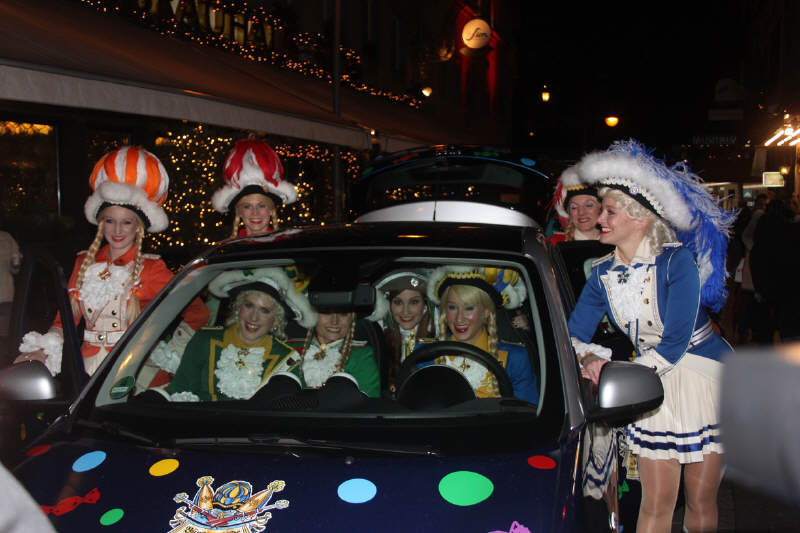 Einen Wehmutstropfen gab es für das blau-goldene Korps - Tanzmarie Sarah Knott hört nach der Session auf und wird auf der traditionellen "Blaue Montagssitzung" der Gesellschaft am Montag vor Weiberfastnacht verabschiedet werden. Doch bis dahin darf Sarah erst einmal mit einen kleinen blau-goldenen Flitzer vom Typ Smart durch Köln fahren, den stellte "Smart Kubina" zur Verfügung. Und die Tanzmariechen-Kolleginnen wollten natürlich alle bei der Jungfernfahrt dabei sein ... acht Mariechen in einem Smart. Ein schönes Bild!