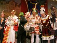 Nach der Pause sorgte das Dellbröcker Boore Schnäutzer-Ballet der K.G. UHU für ein furioses Opening. Die tänzerische Persiflage auf die Traditionskorps sieht man eigentlich viel zu selten auf den Kölner Karnevalsbühnen. Guido Cantz brachte anschließend die Jecken wieder zum Lachen. Beim Aufzug des am gestrigen Abend frisch proklamierten Kölner Dreigestirn der Session 2016 erhielten die Tollitäten einen Überlebenskorb mit Brausetabletten, Kopfschmerzmittel - und einem selbst gebrannten Apothekerschnaps! Na dann, Mahlzeit! Des weiteren erhielten die Tollitäten eine Spende in Höhe von 333,33 €, die an gemeinnützige Projekte zu Gunsten hilfsbedürftiger Kinder weiter gereicht wird. Wicky Junggeburth und Björn Heuser unterhielten die Gäste musikalisch. Das Finale mit Solotrompeter Lutz Kniep gab dann bereits einen Ausblick auf das nächste Jahr, wo die K.G. "Mer blieve zesamme" ihr 80-jähriges Bestehen feiern wird.