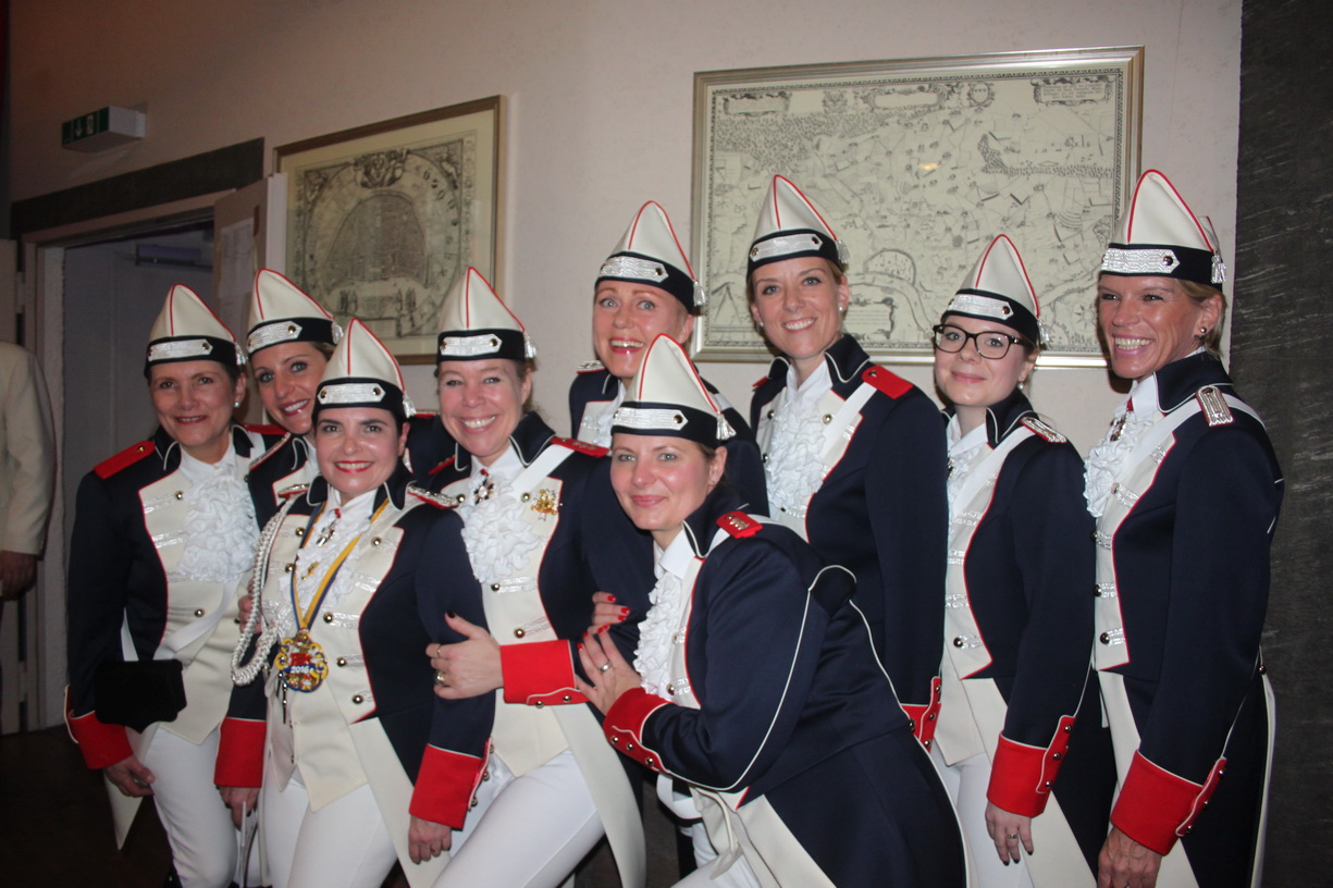 Gleich drei Korpsgesellschaften statteten den Damen ihren Besuch ab - und beim Aufzug von Roten Funken, Prinzen-Garde Köln und der K.G. Treuer Husar wurde es im kleinen GIR-Keller immer sehr knubbelig voll. Und auch das "Dellbröcker Boore Schnäuzer Ballett" der K.G. UHU musste sich auf der kleinen Bühne des GIR-Kellers erst einmal neu sortieren. Redebeiträge gab es von Volker Weininger als "Dä Sitzungspräsident" und Michael Hehn als "Dä Nubbel", der die Damen gleich zwei Mal besuchte: Nach seiner Nubbel-Rede schnappte sich Hehn den Dirigentenstab und marschierte als musikalischer Leiter des Musikzug "Treuer Husar Köln" im Nubbeloutfit (!) mit seinem Korps erneut in den Saal ein! Da machten die Damen der "1. Damengarde Coeln" große Augen! Unter dem Titel "Ahl Kamelle - neu jelötsch" brachten die Musiker um Andreas Münzel bekannte Lieder aus den alten Zeiten der kölschen Musikgeschichte. Und natürlich durfte auf der Aufzug des Kölner Dreigestirn 2016 nicht fehlen, denn die Ehefrau von Bauer Anton, Bettina Maslak, ist Mitglied in der "1. Damengarde Coeln".
