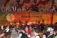 Beim Aufzug des Korps der Bürgergarde Blau-Gold zu Beginn der Sitzung hatte das Kölner Traditionskorps, das seine Wurzeln im Stadtteil Ehrenfeld hat, wirklich alles mitgebracht, was gerade an Mann und Maus verfügbar war! Die Bühne war so voll, dass Teile des Korps sich hinter dem Elferrat aufstellen mussten. Unter anderen waren Präsident Markus Wallpott, Schatzmeister und Steuerberater Günter Flüch sowie Gastronom René Sion mit ihren Kameraden aufgezogen. Das Gerücht, dass sich Beamte - und besonders Finanzbeamte - nur ungern bewegen, wurde beim Auftritt der Klüngelköpp ein für allemal wiederlegt: Der Saal stand, einige Gäste tanzten in den Gängen - und geschunkelt wurde überall! Einen Namenswechsel innerhalb der Session vollzog die nächste Gruppe: Aus der Parodistengruppe "Blom un Blömcher" wurde nur noch die "Blömcher" - aber keine Panik, Hannes Blum ist weiterhin in der Gruppe! Man hat sich aber Verstärkung gesucht und tritt nun zu Viert auf. Daher hat man beschlossen, dass der alte Name nicht mehr passend ist - und einfach zwei Wörter des alten Namens gestrichen. Man heißt ab sofort nur noch "Blömcher". Punkt! Auch am Programm hat sich nicht viel geändert. Hauptsache "Scheissejal!". Die Domstürmer rockten danach die Hütte, bevor Marc "Blötschkopp" Metzger sich auf die ersten Reihen - und damit die versammelte Prominenz der Finanzbehörden - einschoss. Mit den Bläck Fööss ging es in eine späte Pause.