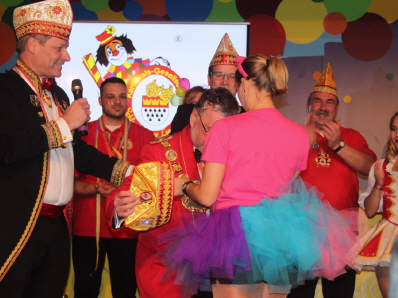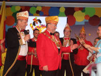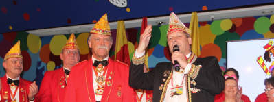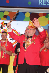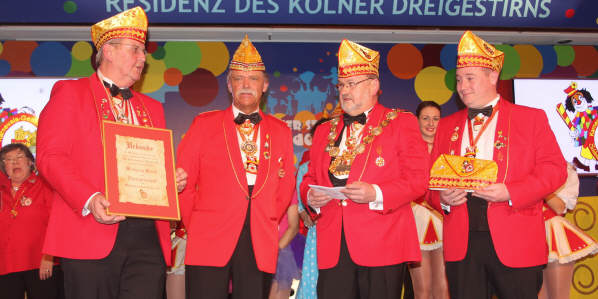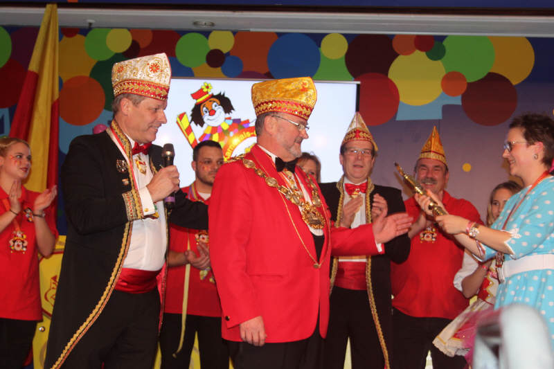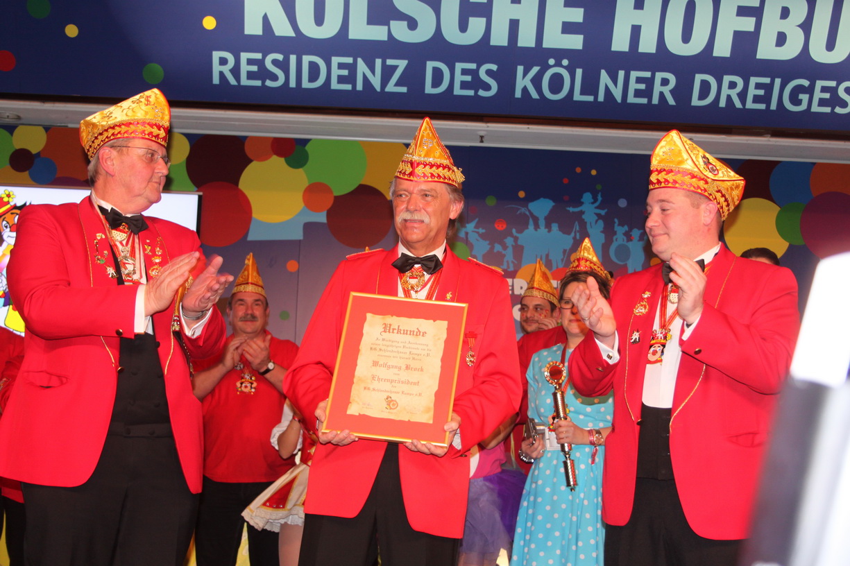 Nachdem sich Vorstand und Elferrat auf der Bühne versammelt hatten, rief Wolfgang Brock, bis zur letzten Jahreshauptversammlung Präsident der Gesellschaft, den Festkomitee-Präsidenten Markus Ritterbach und seinen Vize Christoph Kuckelkorn auf die Bühne. Weiterhin brachte Ritterbach auch die Ehefrau und die beiden Töchter von Hellmut Schramm mit auf die Bühne. Hintergrund war die Übergabe der Präsidenten-Insignien der Gesellschaft an den neu gewählten Präsidenten Hellmut Schramm. Normalerweise wird dieser Akt von Ritterbach vorgenommen, doch dieser war der Meinung, dass die Familie die Übergabe vornehmen sollte. Und so erhielt Schramm durch seine beiden Töchter die Präsidentenkette und das -zepter. Nach einem kurzen Dank wandte sich Schramm an seinen Amtsvorgänger. Er erinnerte an die Verdienste von Wolfgang Brock, der nicht nur 24 Jahre Präsident war, sondern vorher schon zahlreiche Vorstandsämter in der K.G. Schlenderhaner Lumpe inne hatte. So kann Brock auf insgesamt 41 Jahre Vorstandsarbeit in seiner Gesellschaft zurückblicken. Und da Brock bereits alle Auszeichnungen der Gesellschaft, des Festkomitees und des Bund Deutscher Karneval hat, konnte man ihm nur ein Amt bieten - und so ernannte Hellmut Schramm seinen Vorgänger Wolfgang Brock zum Ehrenpräsidenten der Schlenderhaner Lumpe!