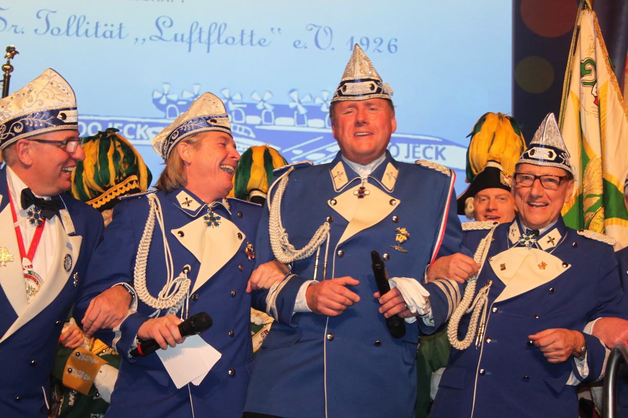 ... doch was war das: Mit den letzten Klängen der "Fauth Dance Company" begann die Jägerkapelle Straberg, einen zünftigen Marsch zu spielen - und es marschierten Abordnungen der Kölner Traditionskorps in den Saal ein. Bei den Saalverantwortlichen des Gürzenich merkte man die Verärgerung an, denn dieser Aufzug war nicht abgesprochen! Hintergrund des Einmarsches war, dass Luftflotte-Präsident Eric Bock und Literat Jürgen Schweder am Aschermittwoch ihre Ämter zur Verfügung stellen. Ihnen zu Ehren zogen die Korps ein und bildeten für die Verabschiedung der beiden langjährigen Vorstandsmitglieder ein farbenfrohes Bild. Der Vorstand der K.G. Sr. Tollität Luftflotte ehrte ihr Kollegen mit dem Fööss-Klassiker "En uns´rem Veedel". Für die Gürzenich-Verantwortlichen ein Fiasko, denn zu dem Zeitpunkt als die Jecken auf der Bühne sangen, sollte eigentlich der Einlass für die zweite Veranstaltung des heutigen Tages starten ...