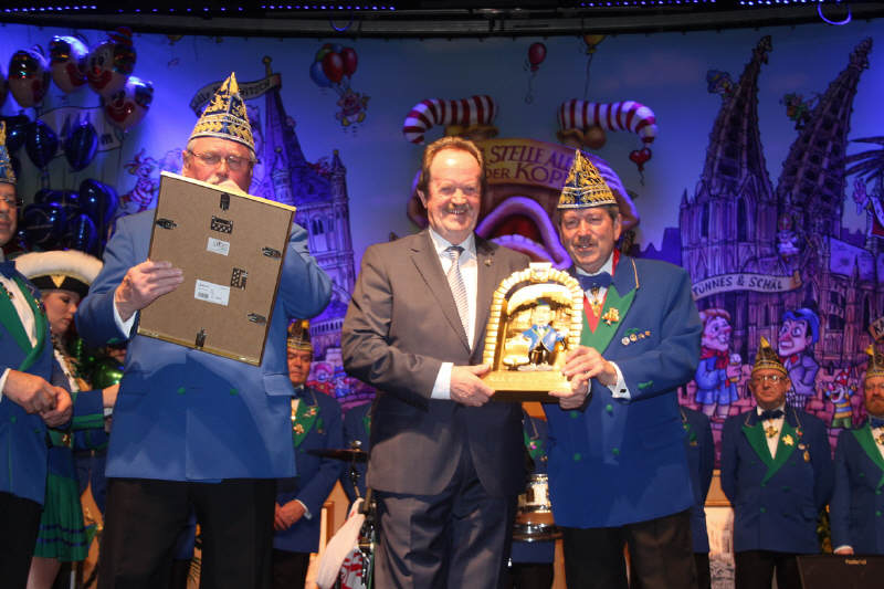 Beim Aufzug des Kölner Dreigestirn der Session 2016 zu Beginn der zweiten Abteilung entdeckten die Tollitäten in der ersten Reihe Hans Süper, den bekannten Komiker des legendären "Colonia Duett". Die Narrenherrscher holten Süper unter dem Jubel der Jecken auf die Bühne, um ihm die Prinzenspange der Session zu überreichen. Nach dem Auszug der Tollitäten kam der Elferrat für eine besondere Ehrung nach vorne auf die Bühne - Peter Raddatz, der als "Mann met däm Höötche" für Jahrzehnte zu den Top-Rednern des Kölner Karnevals gehörte und der vor einigen Jahren in den karnevalistischen Unruhestand gegangen ist, wurde zum "Grielächer des Jahres 2015" ernannt. Präsident Rudi Schetzke übergab Raddatz die gleichnamige in Messing getriebene Ehrengabe, geschaffen von Metallbildhauer Tobias Kreiten. Nach dieser Ehrung sorgten Guido Cantz und Marc Metzger als "Dä Blötschkopp" wieder für Lachsalven, während die Bläck Fööss und die Räuber für Schunkelstimmung im weiten Rund des Maritim Hotel Köln sorgten.